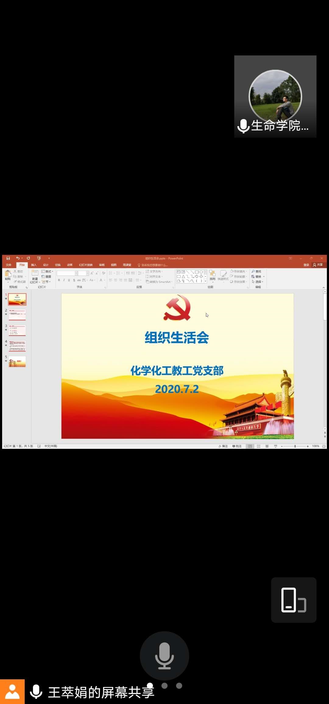 2020-07-067月2日,下午15:30生命学院化学化工系党支部在云端召开了一次特别的党支部组织生活会。此次组织生活会正值中国共产党99岁生日,以讲疫情...