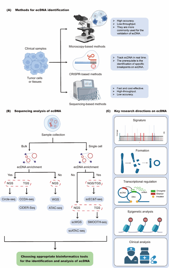 染色体外DNA (extrachromosomal DNA, ecDNA)来源于染色体,是一种癌症特异性的环状DNA分子。EcDNA驱动肿瘤的发生和进展,这与多种癌症的不良临床结果和耐药性有关。在过去几十年,由于技术的限制,人们对ecDNA的研究长期停滞不前,然而,近年来,随着生物学技术的进步,特别是基因组技术和新的生物信息学方法的出现,开辟了新的研究途径,ecDNA的相关研究得以快速进展,大大拓宽了我们对其结构和生物学功能的理解。高通量测序技术、第三代测序技术、单细胞测序技术以及优化的数据分析方法等已成为ecDNA研究中的有力工具,为绘制人类癌症以及疾病组织中ecDNA的景观提供了机会。