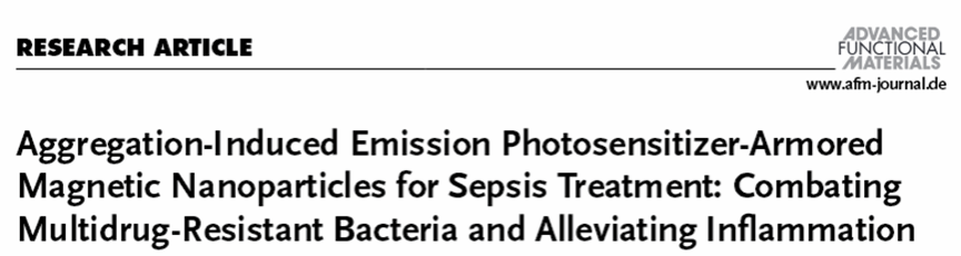 Wang, J.-L., Chen, Y., Song, J.-X., Guo, B.-W., Xia, F.-W., Wan, Y., Wu, W.-X., Zhang, C., Feng, S., Wu, M.-Y., Aggregation-Induced Emission Photosensitizer-Armored Magnetic Nanoparticles for Sepsis Treatment: Combating Multidrug-Resistant Bacteria and Alleviating Inflammation. Adv. Funct. Mater. 2023, 2312162. DOI: 10.1002/adfm.202312162