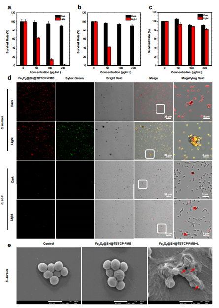该研究制备了一种阳离子AIE光敏剂武装的磁性颗粒,即Fe3O4@SH@TBTCP-PMB,用于治疗败血症。阳离子光敏剂具有高效的ROS生成效率和优秀的细菌结合能力,这些特性与Fe3O4的磁捕获和磁分离特性协同作用,使得Fe3O4@SH@TBTCP-PMB在低浓度下能够迅速捕获革兰氏阳性细菌,并在光照条件下显著灭活耐药细菌。AIE PS功能化的磁性NPs展现出广泛的应用潜力,通过抑制炎症因子和细胞因子以减少炎症反应,有助于改善多器官功能障碍,恢复先天免疫防御系统,为克服多药耐药细菌引发的血液感染提供了有效的治疗策略。