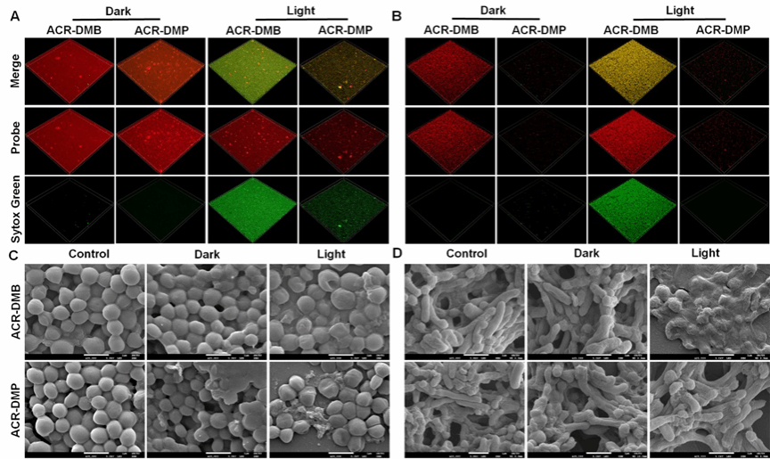在此基础上,该团队在质膜靶向抗菌的理念指导下,通过调节正电荷数目和多糖靶向的硼酸基团提高质膜结合能力和EPS渗透性,设计合成系列I型PS(ACR-DM、ACR-DME、ACR-DMB和ACR-DMP)。合适的D-A体系可以减少激发的三重态和基态之间的能隙,阻止与氧气的能量交换过程,从而通过电子转移促进I型ROS的产生,有效克服生物膜缺氧微环境。其中ACR-DMP修饰了硼酸基团,可与细胞壁、EPS 和质膜糖蛋白中丰富的多糖中存在的顺二醇基团高效结合,不仅可以增强生物膜的结合和清除活性,还抑制信号转导系统和外排泵,有效避免耐药性的产生,抑制生物被膜的复发。(图1)