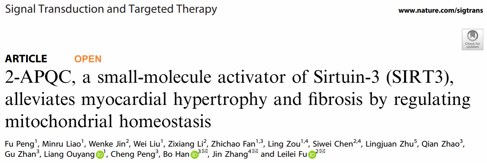 近日,开云kaiyun网页版官网符雷蕾课题组联合四川大学药学院彭芙课题组与深圳大学药学院张瑾课题组及成都中医药大学药学院的合作者们在Signal Transduction and Targeted Therapy (中科院一区Top期刊,影响因子:39.3) 上共同发表了题目为“2-APQC, a small-molecule activator of Sirtuin-3 (SIRT3), alleviates myocardial hypertrophy and fibrosis by regulating mitochondrial homeostasis”的研究性论文,论文的最后通讯作者为开云kaiyun网页版官网的符雷蕾副教授。