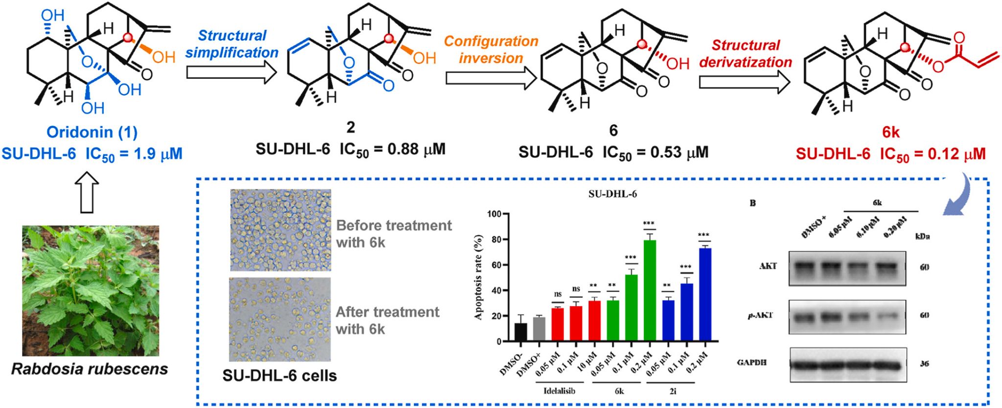 为深入探究构效关系,作者将构型翻转化合物6(C14α‑OH)及其天然对应物2(C14β‑OH)转化为46个C14‑O‑酰化衍生物(6a‑6w与2a‑2w)。抗增殖活性测试与初步构效关系分析显示,该类衍生物的活性受立体构型与取代基类型的共同调控,二者的协同优化是提升药效的关键。与具有相同取代基的C14β构型对应物2k(IC₅₀ = 0.71 μM)和2l(IC₅₀ = 0.47 μM)相比,C14α构型的化合物6k(IC₅₀ = 0.12 μM)和6l(IC₅₀ = 0.31 μM)表现出更优的抑制活性。其中,活性最强的化合物6k(C14α 丙烯酸酯取代)在SU‑DHL‑6细胞系中的IC₅₀仅为0.12 μM,活性分别为其母体化合物6的4.4倍和冬凌草甲素的16倍。初步机制研究表明,6k可诱导SU‑DHL‑6细胞凋亡并下调p‑Akt蛋白表达,但对细胞周期进程无明显影响。