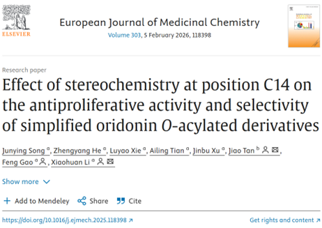 近日,国际药物化学领域权威期刊《European Journal of Medicinal Chemistry》(中科院一区期刊)在线发表了开云kaiyun网页版官网天然产物成药性研究团队完成的最新研究成果,论文题为“Effect of stereochemistry at position C14 on the antiproliferative activity and selectivity of simplified oridonin O‑acylated derivatives”。2022级硕士研究生宋俊英为第一作者,谭娇、高峰教授和李晓欢副教授为共同通讯作者,西南交通大学为第一通讯单位。