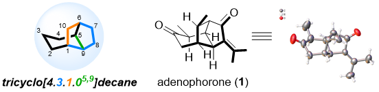 高峰教授课题组从紫茎泽兰植物的叶子中首次发现一个具有独特笼状三环[4.1.05,9]癸烷结构的倍半萜类新骨架化合物—(−)-adenophorone(1)(图1),通过NMR及X-Ray鉴定了该新骨架倍半萜的结构,并基于仿生策略高效简洁地完成了新化合物的不对称全合成研究。