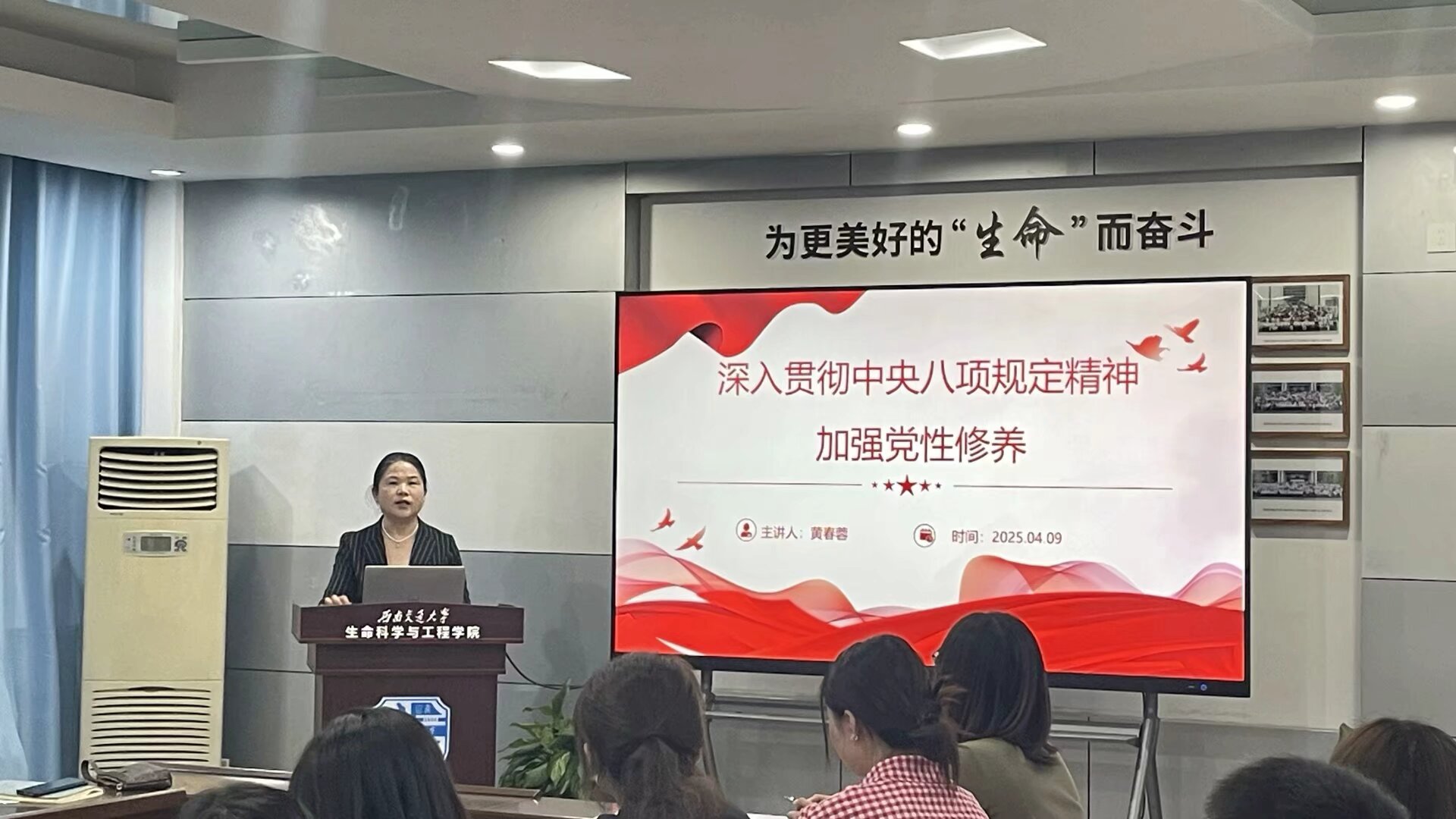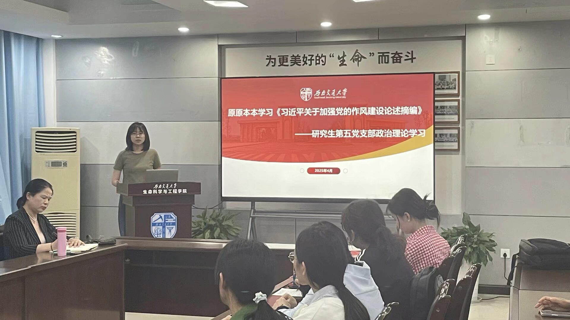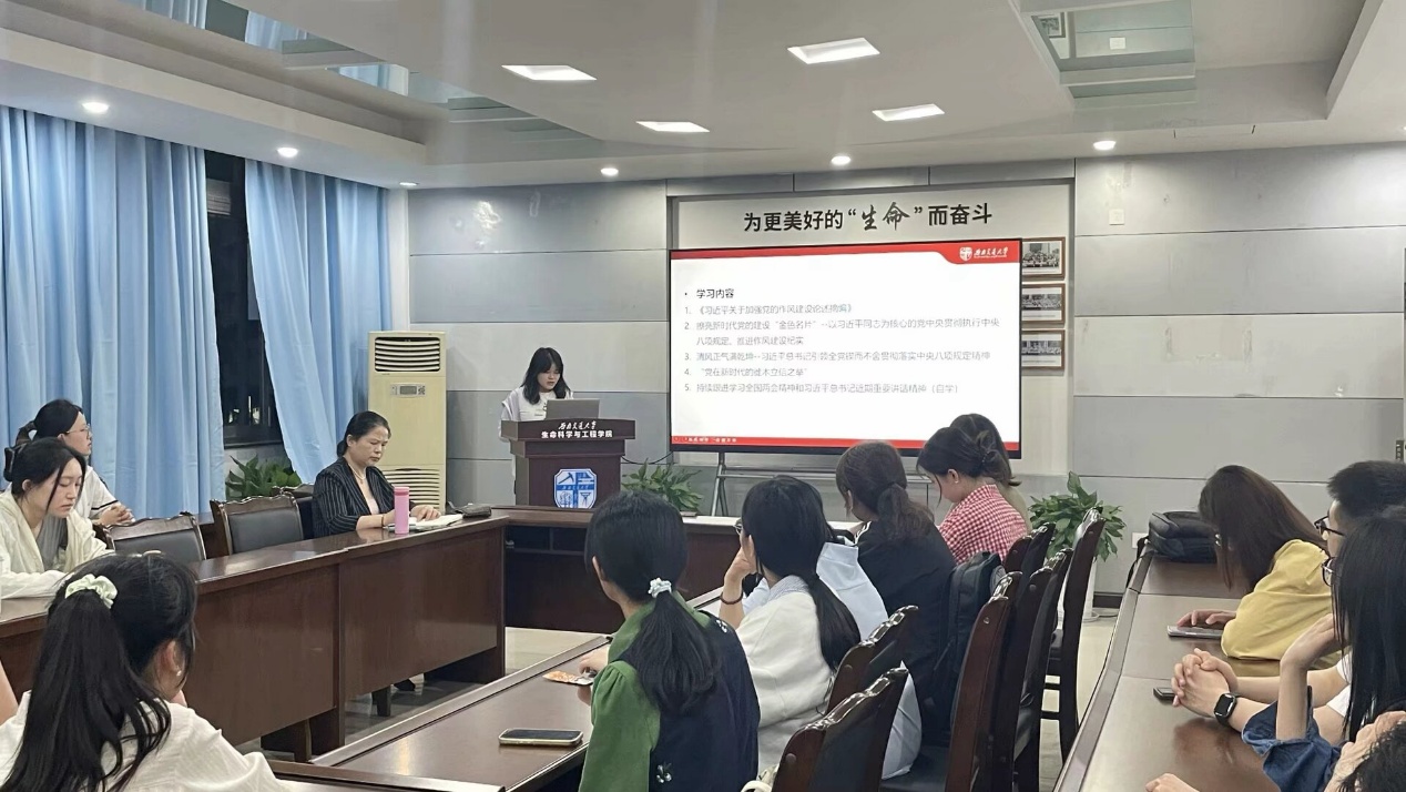 按照学校和学院深入贯彻中央八项规定精神学习教育部署和工作安排,生命科学与工程学院研究生第五党支部于2025年4月10日19:30在J3609开展了主题党日活动,会议由党支部书记陈硕主持,学院党委书记黄春蓉参加活动并讲党课,旨在加强党员作风建设,提升党员思想觉悟,推进作风建设常态化长效化。