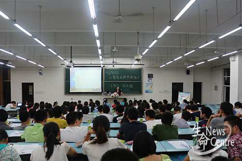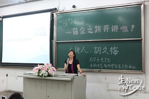 在欣赏完短片后,药学系主任胡久梅为同学们献上了又一份“大礼”。她结合自身从生产技术到药物研究再到药物经营等职位的经历带同学们初步跨入药企的大门。之后,她详细介绍了执业药师的相关考试时间、条件以及准备等,并希望大三同学能于2018年10月,大二同学于2019年10月考取此证书。她强调只要努力,便一定没有问题。接着,胡久梅老师针对最近肆虐西非的“埃博拉”病毒为主题,向同学传达了作为制药人应该不害怕、不逃避,做好药学的精神。最后,她给同学们分享了自己喜爱的诗歌并同全体同学一起朗读。
