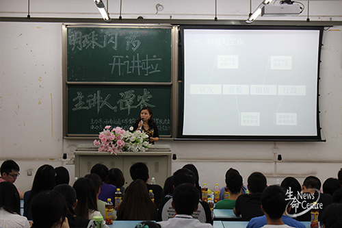2014年9月27日,由本科中药学生党支部、本科制药学生党支部和药学系教工党支部组织的明珠闪“药”课堂在犀浦校区X2416教室开讲。生命科学学院李卓慧书记,副书记罗妍妍,副院长谭睿,学院党委委员、教工党支部书记、工会主席胡久梅,以及学生支部指导教师孔琳、高鹏、魏源成等人出席讲座。