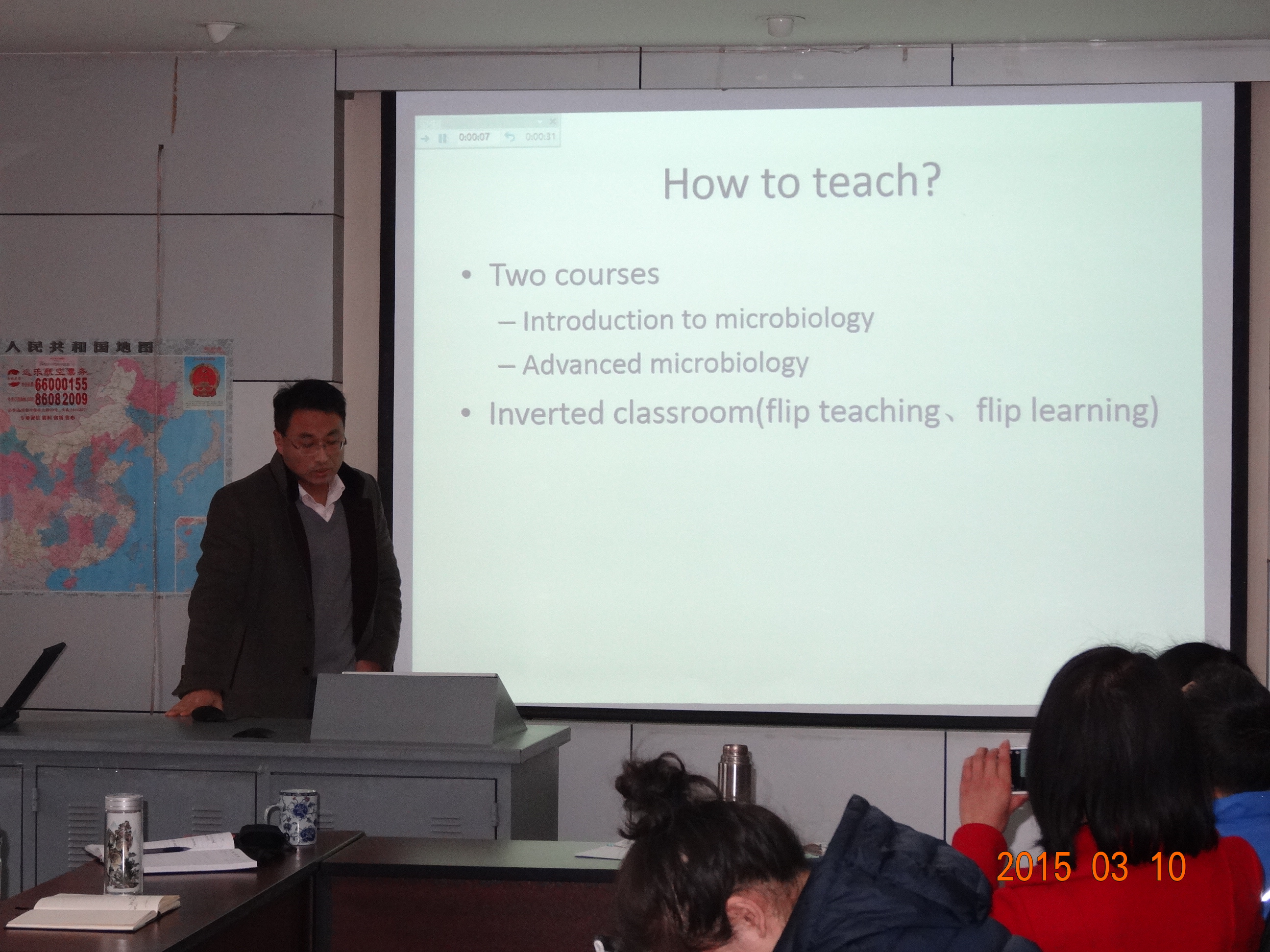 2014年学院出国学习归国的闫智勇、万军、王万军、廖海、郭泰林、刘新荣6位老师分别就自己在国外的专业课程学习、英语能力学习、科研学习等方面的收获与心得依次做了专题汇报,6位老师会前都做了精心准备,会上使用PPT图文并茂的交流了自己的研修或访学情况、收获与体会。并表示出国学习开阔了视野、启迪了思维,在教学和科研中也收获了一些经验,这些经验将结合工作实际运用到今后的教学科研工作中。