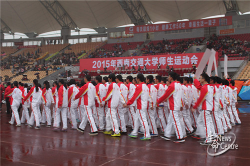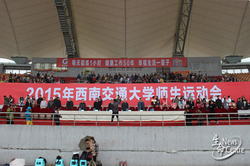 11 14 8:00 ,西南交通大学师生运动会开幕式在犀浦校区田径场隆重举行。出席本次开幕式的领导有西南交通大学党委书记王顺洪,校长徐飞,党委副书记陈志坚、桂富强,副校长蒲云。
