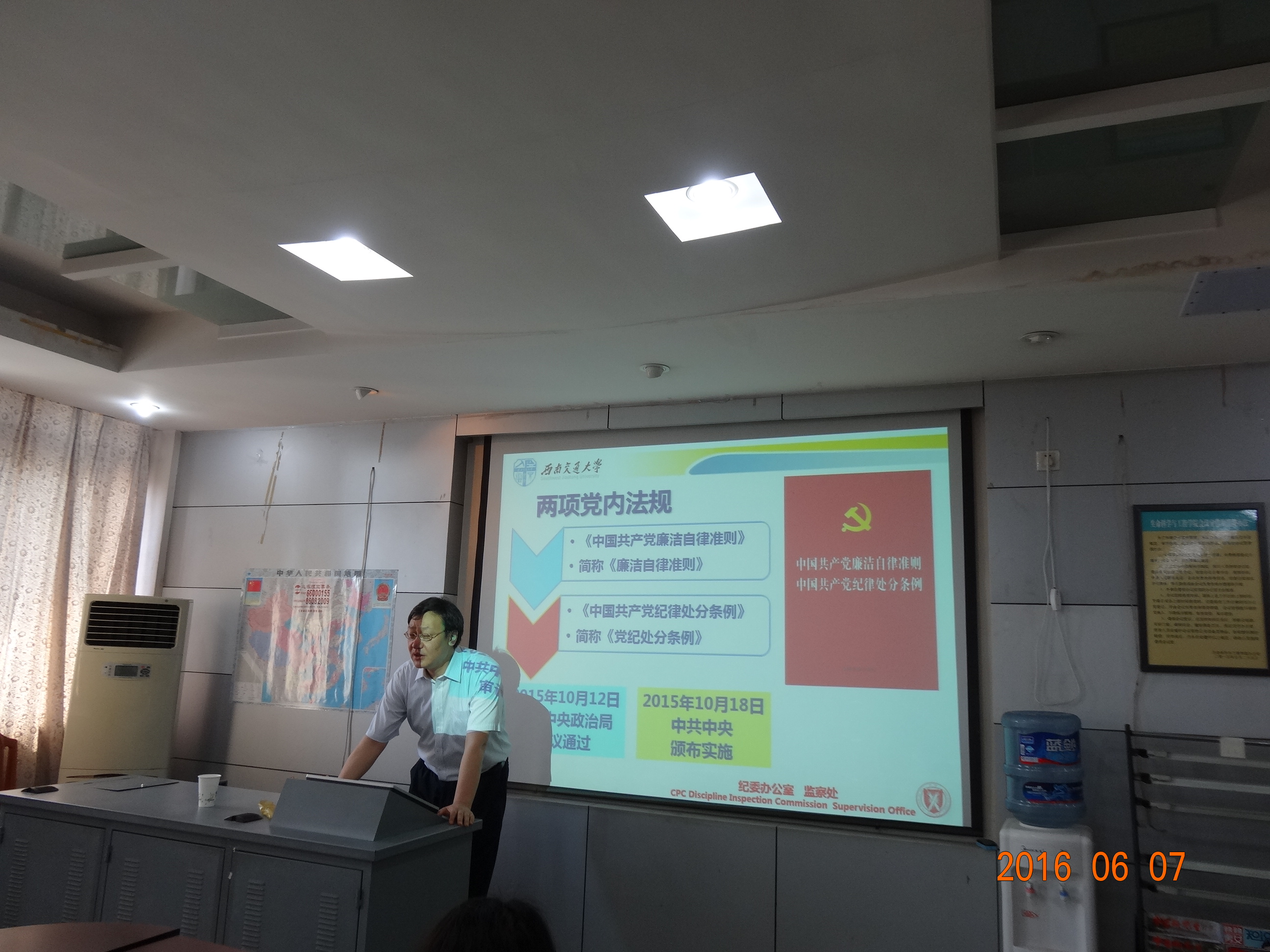 校党委陈志坚副书记用2个多小时的时间为与会人员讲了两个专题的党课:分别是《学党章用党章》和《坚持党要管党从严治党,明确道德“高线”和纪律“底线”——<准则><条例>学习体会》。陈书记首先从如何树立党员意识、强化理想信念入手,详细讲解了《中国共产党章程》的历史、学习《中国共产党章程》的重大意义,以及《中国共产党章程》的主要内容,并阐述了合格党员标准、如何做合格的共产党员;强调了坚持民主集中制、发挥党的基层组织战斗堡垒作用、严格执行和维护党的纪律等方面的内容;同时指出《中国共产党章程》作为党的总章程和根本大法,在党员学习教育和党组织建设中发挥着极为重要的作用,全体党员一定要遵循《中国共产党章程》要求、坚定理想信念、践行根本宗旨、秉持严实作风,做合格党员。接下来他还带领与会人员学习了《中国共产党廉洁自律准则》和《中国共产党纪律处分条例》,介绍了《准则》和《条例》的出台背景、修订的意义和主要内容,特别强调了《准则》的“高线”要求和《条例》的“底线”规定,并结合师生学习、工作和生活实际,结合典型案例重点讲解了党的六大纪律所规定的主要内容,号召全体党员特别是党员领导干部要“知敬畏、存戒惧、奔高线”,严格要求自己、强化党性观念、贯彻落实好《准则》和《条例》。两个多小时的党课内容信息量大、重点突出、结合实际、案例丰富,校党委陈志坚副书记严谨的思路、系统的阐述和深入浅出的解读让全体参会人员收获良多,使大家更进一步深入了解和掌握了《中国共产党章程》、《准则》和《条例》的内容,并进一步深化了党员意识、坚定了理想信念、强化了党纪观念,增强了政治意识、大局意识、核心意识、看齐意识。
