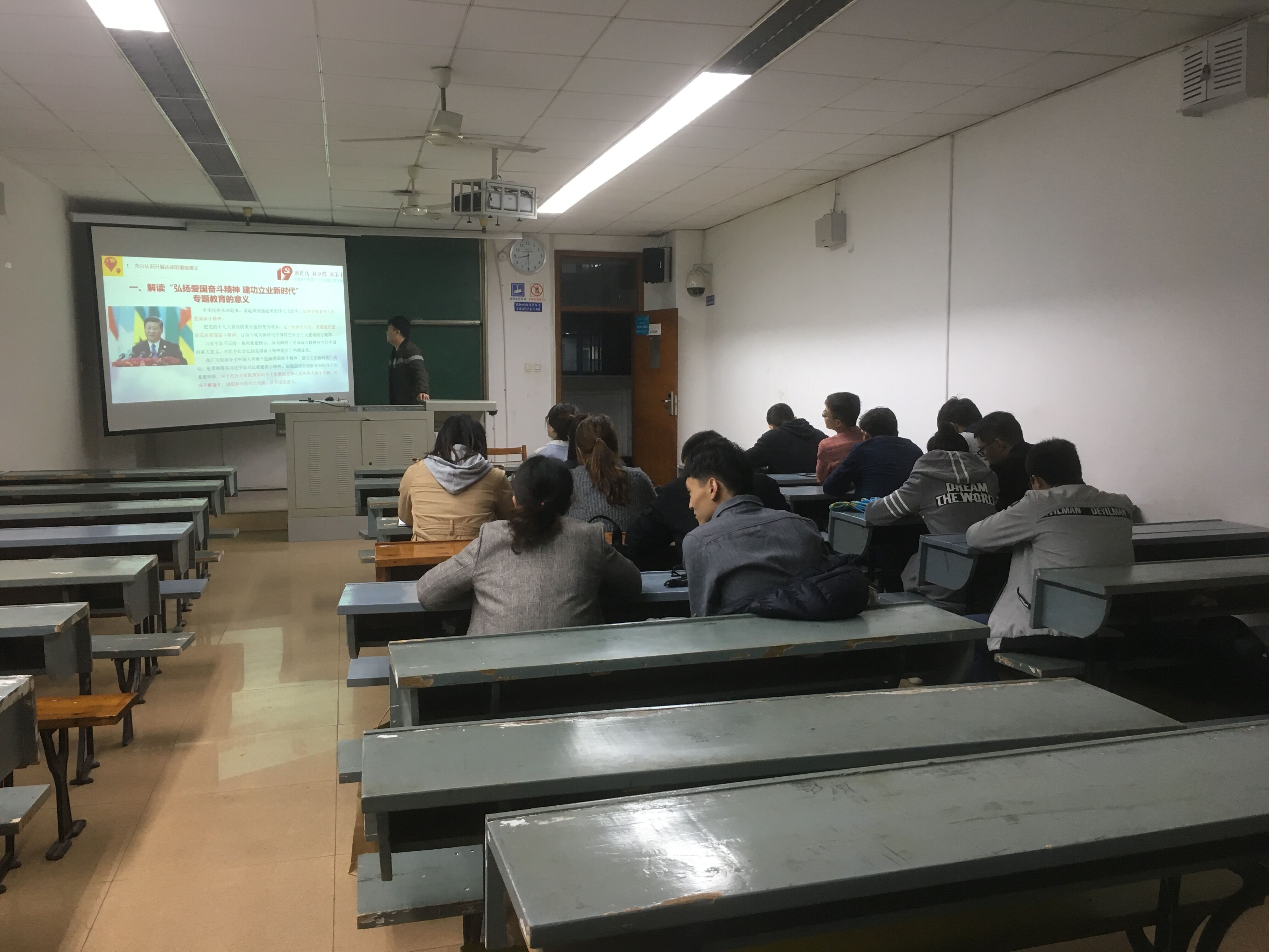 首先, 韦乐华同志介绍了专题党日活动教育的重要意义,应中共中央组织部、宣传部要求,组织学生党员认真学习领会习近平总书记重要指示精神,引导学生党员在新时代自觉弘扬践行爱国奋斗精神,不忘初心、牢记使命,增强“四个意识”,坚定“四个自信”,把个人理想自觉融入国家发展伟业,在祖国最需要的地方建功立业,做新时代的奋斗者,为实现“两个一百年”奋斗目标、实现中华民族伟大复兴的中国梦贡献智慧和力量。