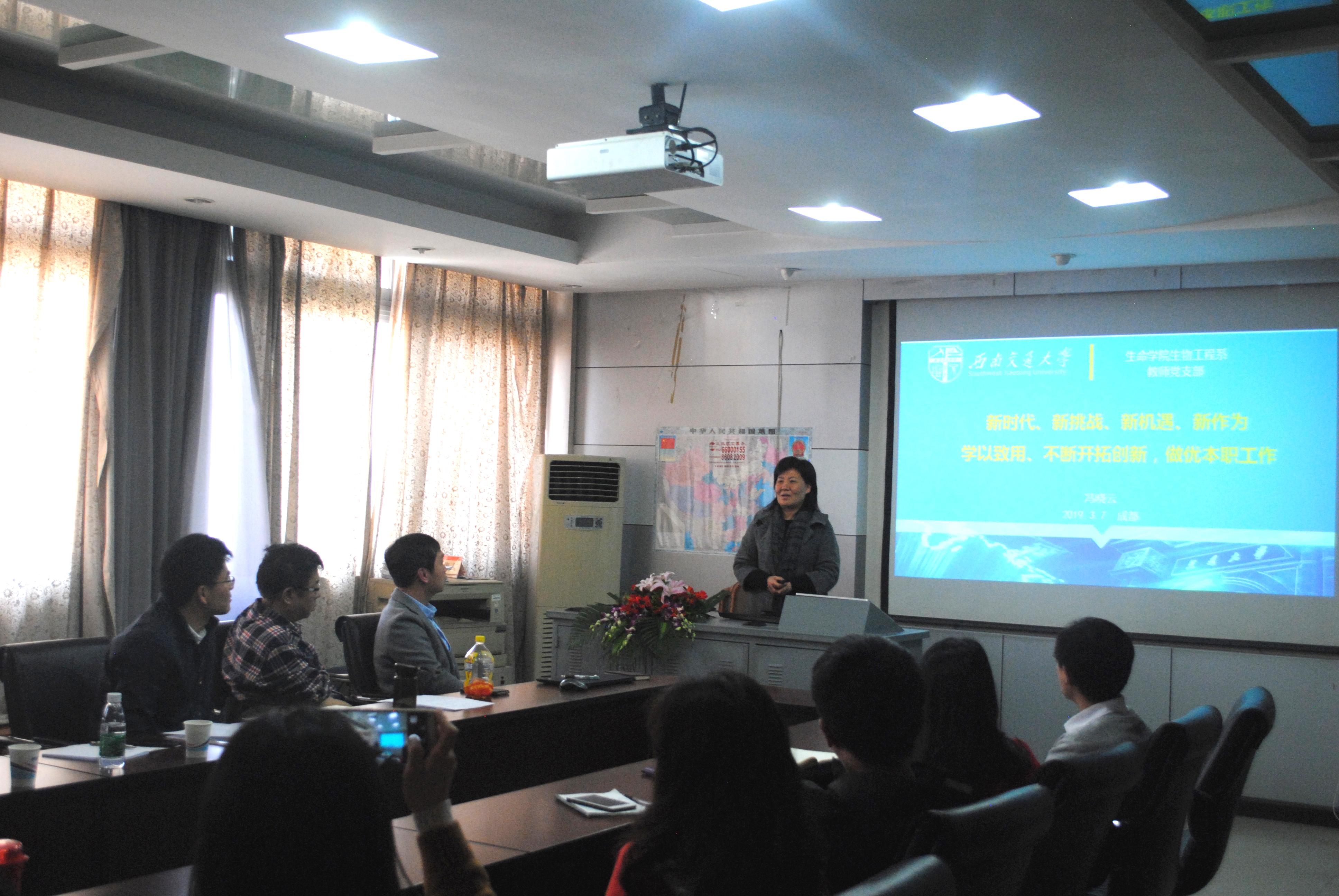 3月28日下午,生物工程系全体党员教职员工齐聚九里校区电气馆3609,开展习近平总书记在高校思政教师座谈会上讲话精神的集中学习,围绕“立德树人”全面推进生命板块人才培养工作进行研讨,冯晓云副校长来到学院参加了本次主题学习活动并作了重要讲话。生命科学与工程学院党委书记葛永明同志参加了本次主题学习,生物工程系党支部书记孟涛同志主持研讨。