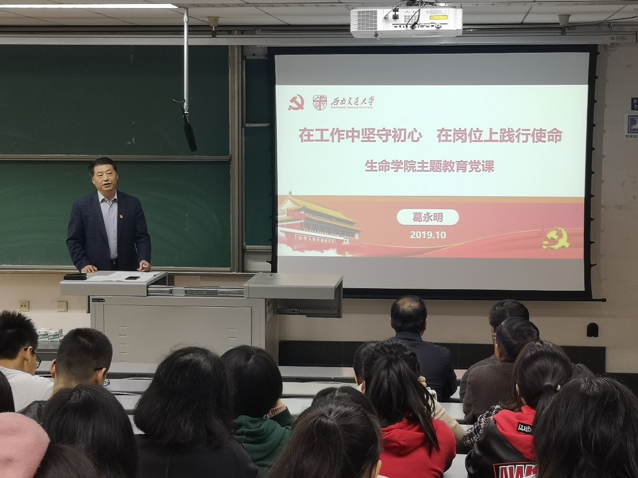 为推进“不忘初心、牢记使命”主题教育扎实开展,引导广大党员同志提高思想认识,坚定理想信念,按照《生命科学与工程学院开展“不忘初心、牢记使命”主题教育实施方案》要求,2019年10月31日下午14:30,在九里校区4422教室,生命科学与工程学院党委书记葛永明同志以“在工作中坚守初心,在岗位上践行使命”为主题,结合自己的学习体会,为全院师生党员讲授专题党课。