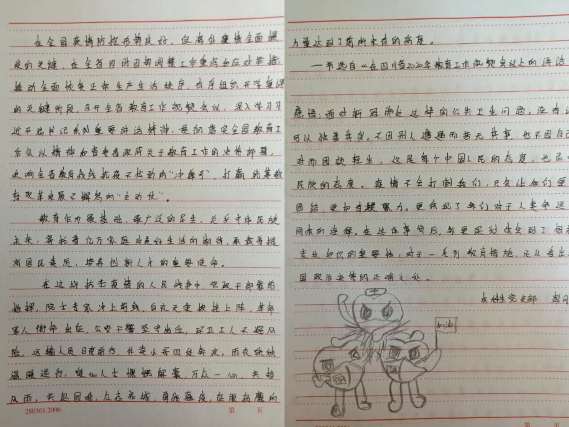 线上会议结束后,支部各位党员同志、积极分子以摘抄、写感悟、配图文的形式认真学习会议精神,贯彻学校党委“抓好疫情防控不放松,抓好各项重要工作不懈怠”的要求。