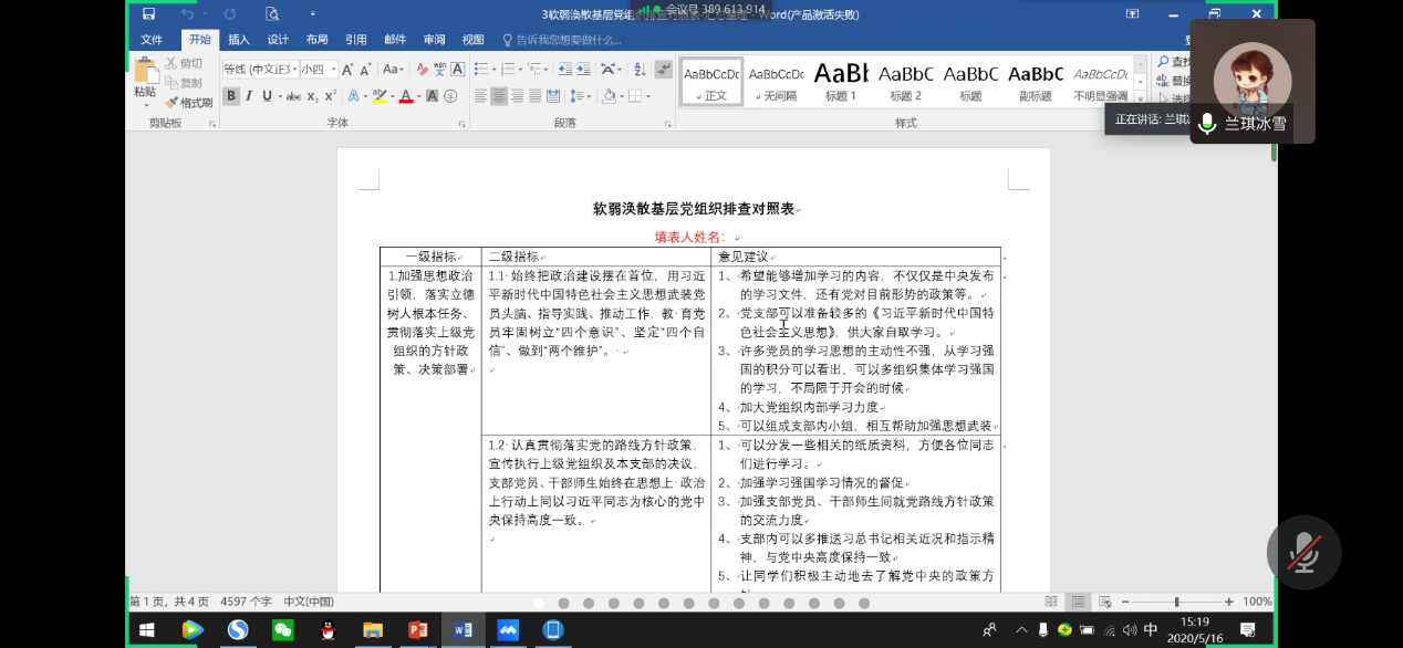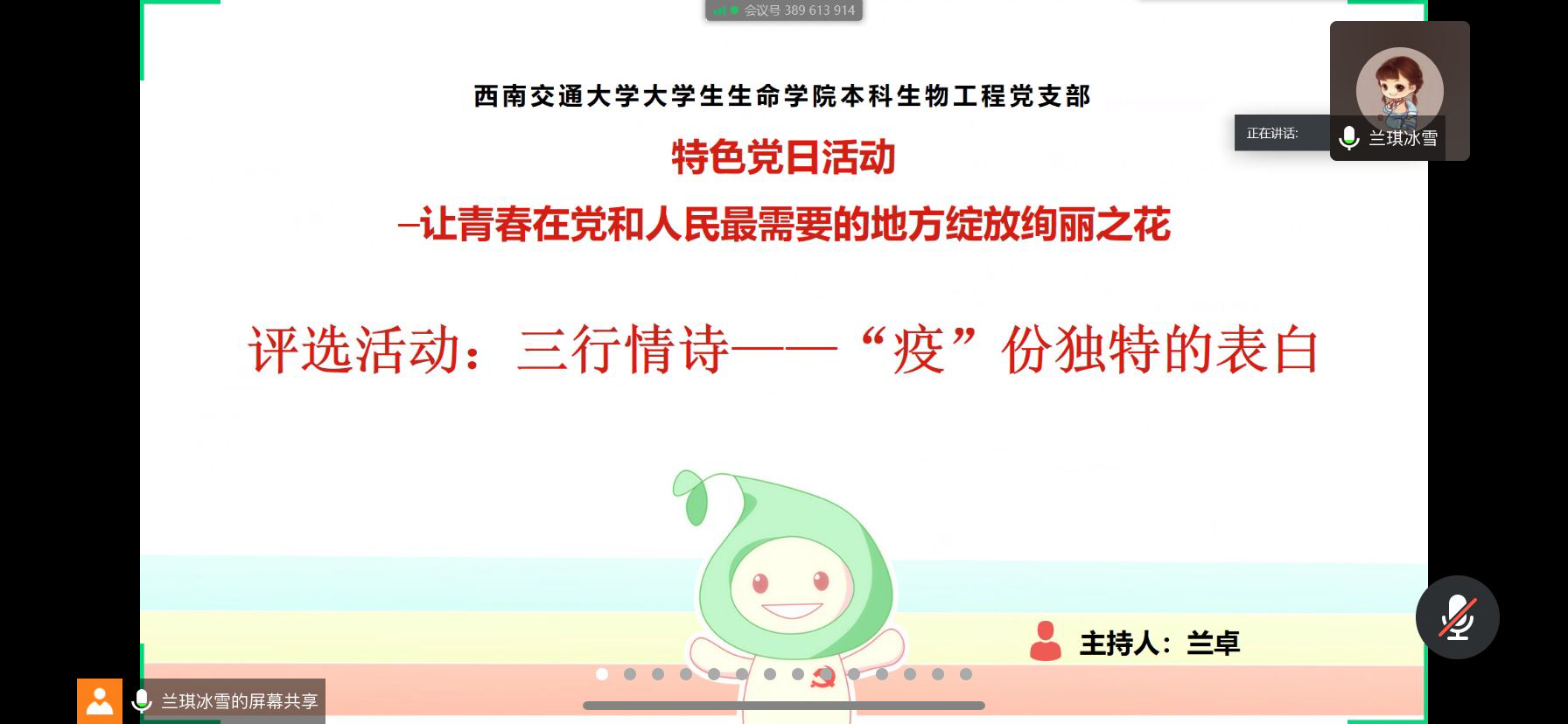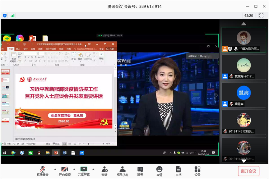 生命科学与工程学院本科生物工程党支部于2020年5月16日下午15时通过腾讯会议召开了以“让青春在党和人民最需要的地方绽放绚丽之花”主题的云党日活动,本次活动由党支部副书记兰卓主持,党支部全体成员参加。