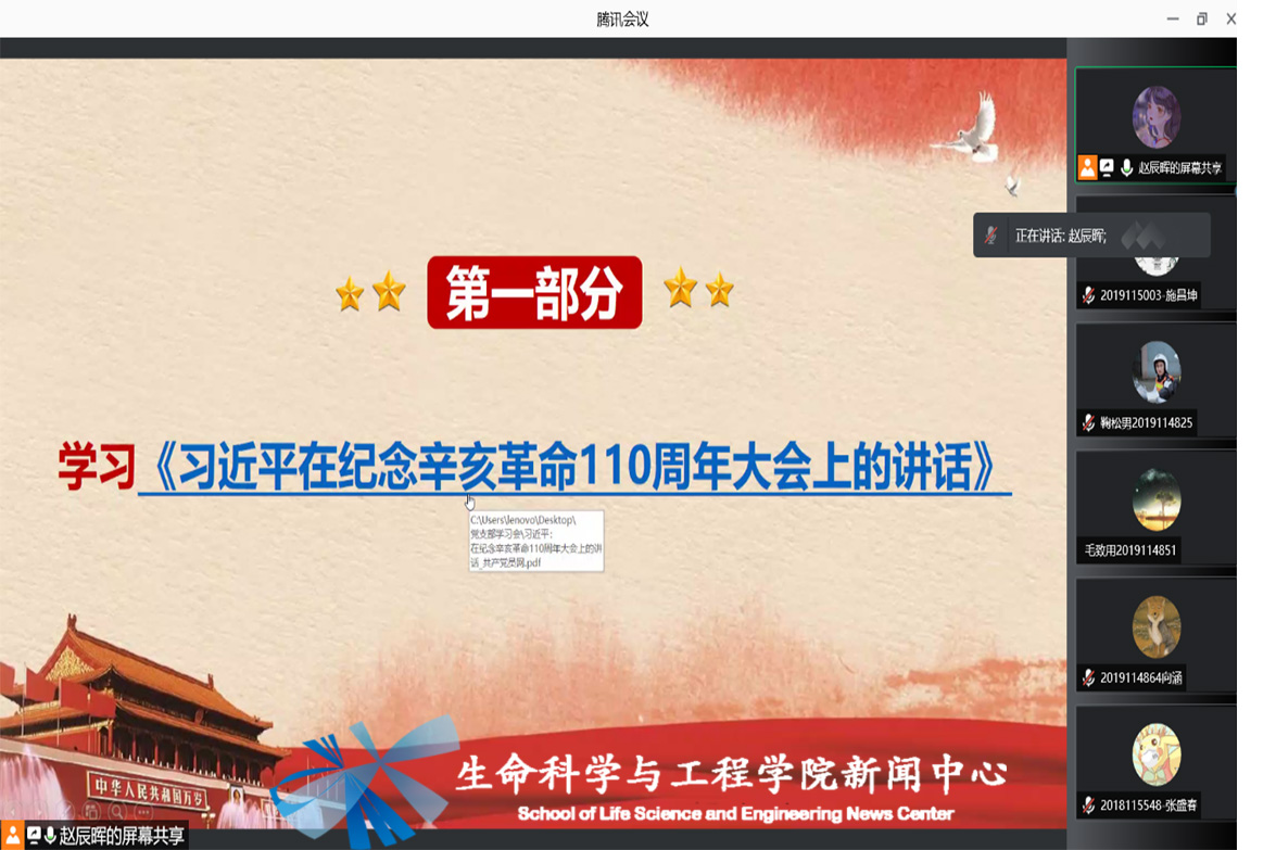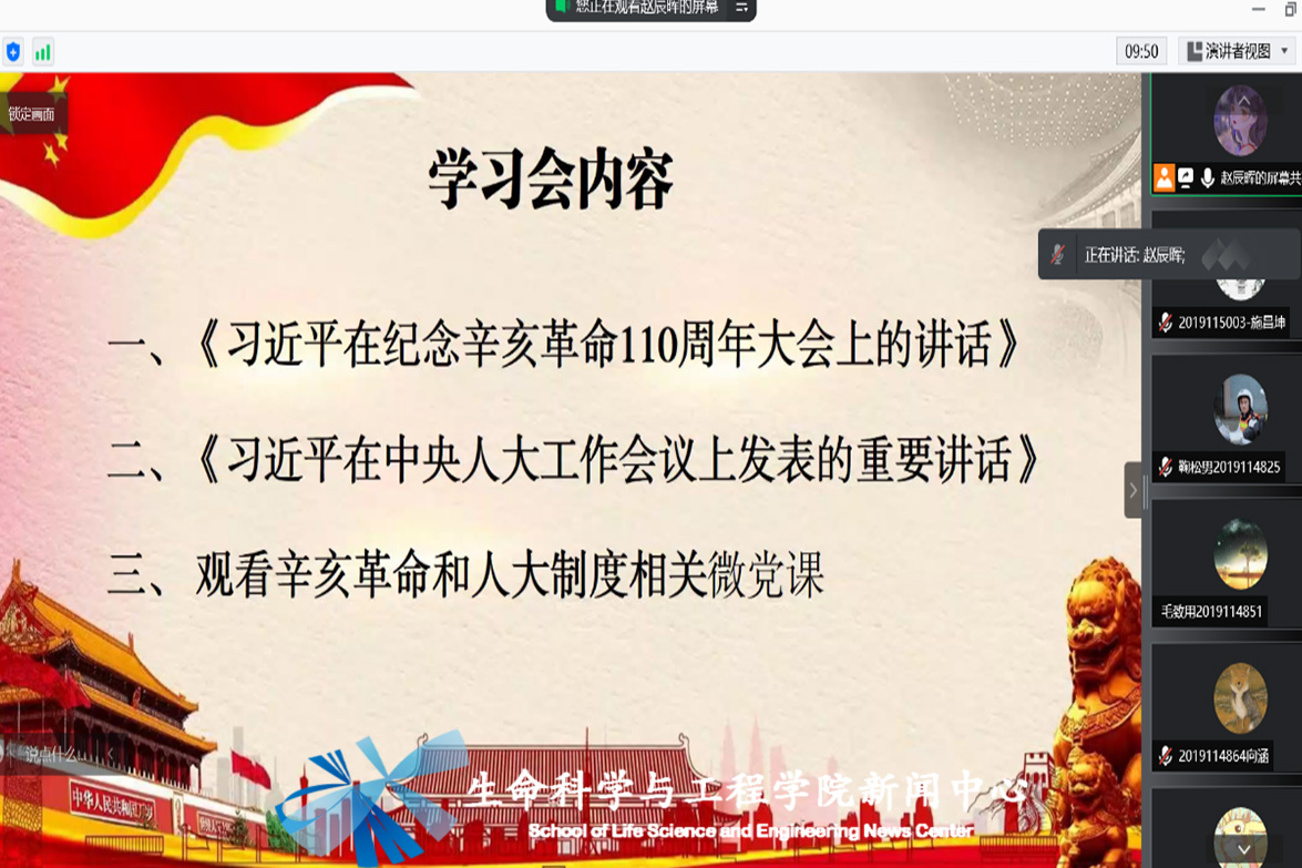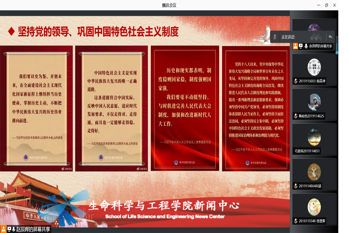 为深入开展党史学习教育,引导支部成员学习党的历史、了解政治制度、培养爱国情怀,生命科学与工程学院本科生物工程党支部于2021年10月25日下午8时,组织支部成员开展了主题为“中国共产党百年与政治制度建设”的线上学习会议。本次会议由赵辰晖同志主持。