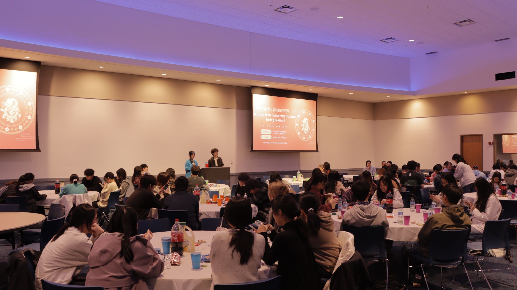 2024年2月10日中午,乔治亚州立大学(Georgia State University, GSU)生物系中国学生会(Biology Chinese Student Association, BCSA) 在GSU学生中心宴会厅举办了春节活动,老师和同学们欢聚一堂,辞旧迎新,共同庆祝中华民族最重要的节日——春节。西南交通大学-乔治亚州立大学生物工程中外合作办学项目美方负责人Phang-Chang Tai教授,Hongmei Zhang老师出席本次活动,交大中美班赴美的2020、2021级全体同学参与了本次活动。