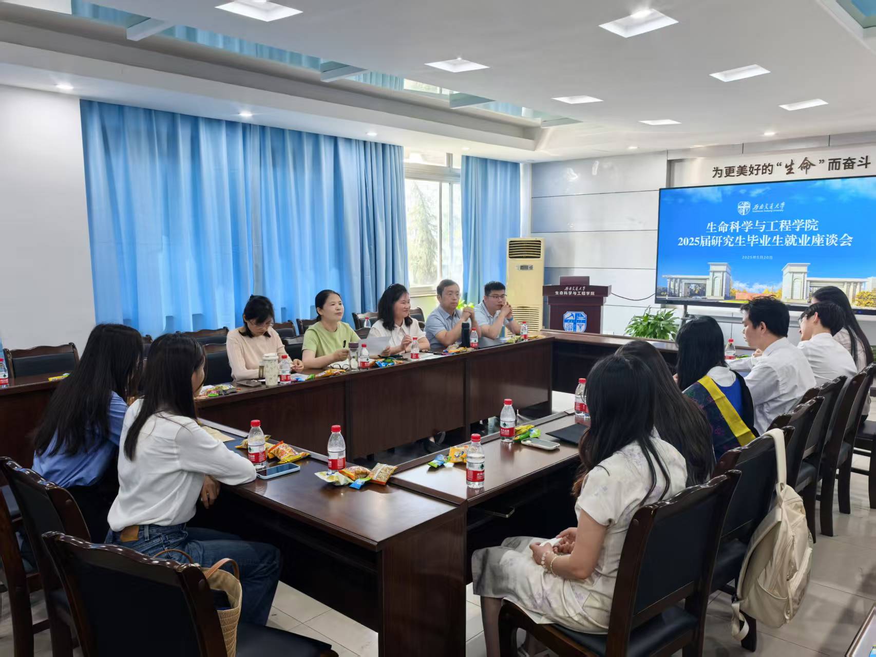 为精准掌握学生求职需求,助力2025届研究生实现更充分、更高质量就业,5月20日,生命科学与工程学院在九里校区组织召开2025届研究生毕业生就业座谈会。学院党委书记黄春蓉、副院长陈琳、党委副书记高鹏、团委书记杨颖增及研究生导师代表与毕业生代表进行了深入交流。