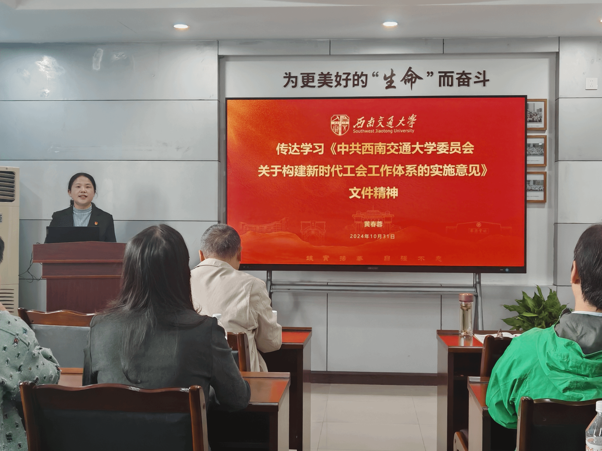 随后,学院党委书记黄春蓉带领全体参会人员传达学习了《中共西南交通大学委员会关于构建新时代工会工作体系的实施意见》文件精神。