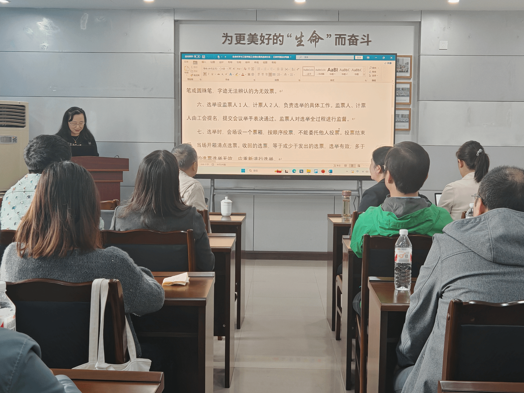 最后,进行大会选举议程,选举工作由学院工会副主席陈琳主持。大会以举手表决的方式一致审议通过了《生命科学与工程学院工会增补委员选举办法》和监票人、计票人名单。经大会无记名投票,选举赵周鉴同志为生命科学与工程学院工会第五届委员会委员。