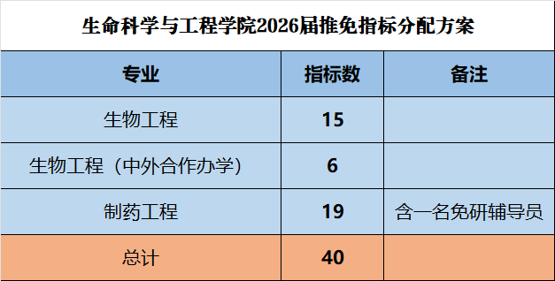 2、对于各专业无法完成指标的情况,将由生命科学与工程学院2026届推免工作小组统筹分配。