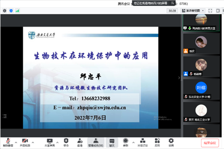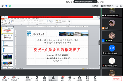 为加深全国优秀大学生对我院各学科的了解,促进各高校优秀本科生之间的交流,给广大优秀本科生提供了解西南交通大学科研、学习、生活的机会,吸引更多优秀大学生加入西南交通大学进行研究生阶段的学习,生命科学与工程学院于2022年7月6日至7月7日在线上举办了2022年优秀大学生暑期学术夏令营。此次夏令营成功吸引了来自全国各地80所高校,120名优秀学子的踊跃报名。经学院择优筛选,来自48所高校的65名优秀学子脱颖而出,获得了参加本次夏令营活动的资格。此次夏令营活动包含开营仪式、学术讲座、营员个人风采展示、师生交流以及结营仪式五个环节,全程通过腾讯会议线上进行。出席嘉宾包含学院党委书记葛永明、学院副院长高峰及王雅雯教授、茆灿泉教授、谭睿教授、邱忠平教授等30余名老师。会议全程由研究生辅导员杨颖增老师主持。