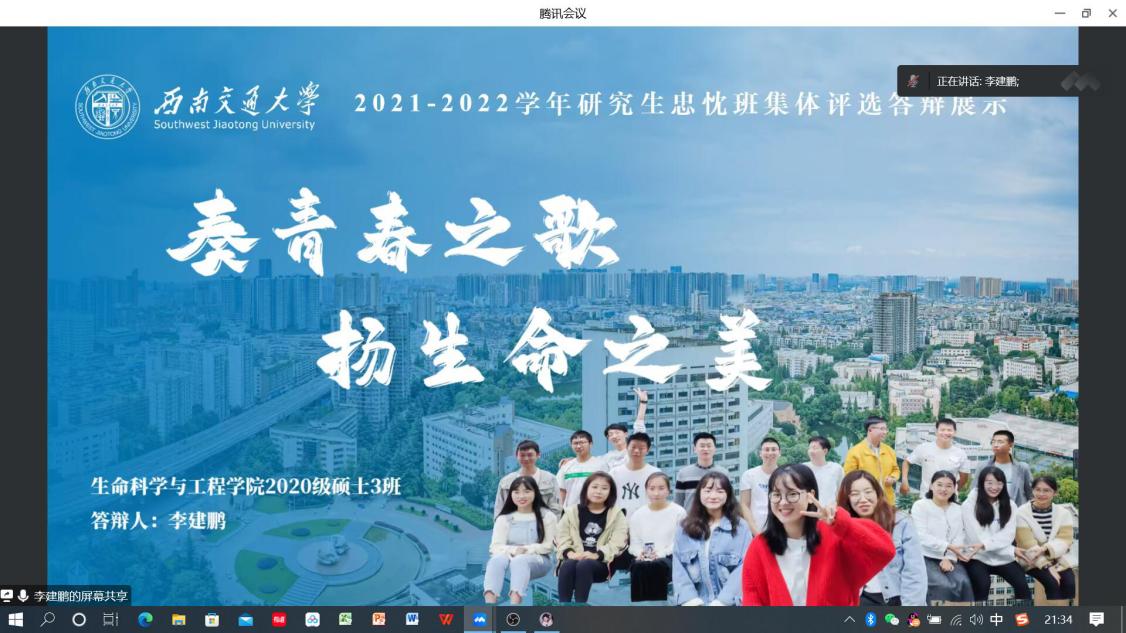 2022年研究生忠忱班集体获奖班级-2020级硕士3班团支书李建鹏以“奏青春之歌,扬生命之美”为主题展示了2020级硕士3班的班级风采,重温了“忠忱班集体”答辩现场。接着,李建鹏同学主要就忠忱班集体的评选工作的一些经验和技巧进行了分享。他指出,精美的答辩PPT在答辩过程中很加分。比如,在PPT上放上自己班级同学的合照就是一个亮点。在前期准备工作时一定要多次反复地研究PPT及讲稿,并不断地完善修改。最后,李建鹏还在班级建设及管理等方面提出了一些经验和方法,给低年级班级建设提供了学习和参考。