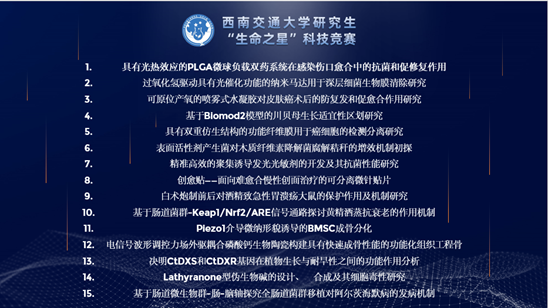 本届研究生生命之星科技竞赛吸引来自材料科学与工程学院、医学院和生命科学与工程学院共计46支队伍报名参赛,100余名研究生参赛,35支队伍作品入围初赛,经过初赛评审,共有15件作品入围决赛。