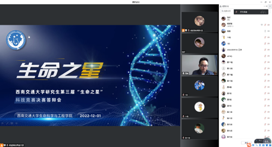 12月1日下午,由西南交通大学研究生院主办,生命科学与工程学院承办,2022年西南交通大学研究生“生命之星”科技竞赛决赛在线上举行。材料科学与工程学院周绍兵教授、屈树新教授医学院谭欢副教授生命科学与工程学院副院长高峰教授,生命科学与工程学院王雅雯教授、孟涛教授莅临本次比赛。