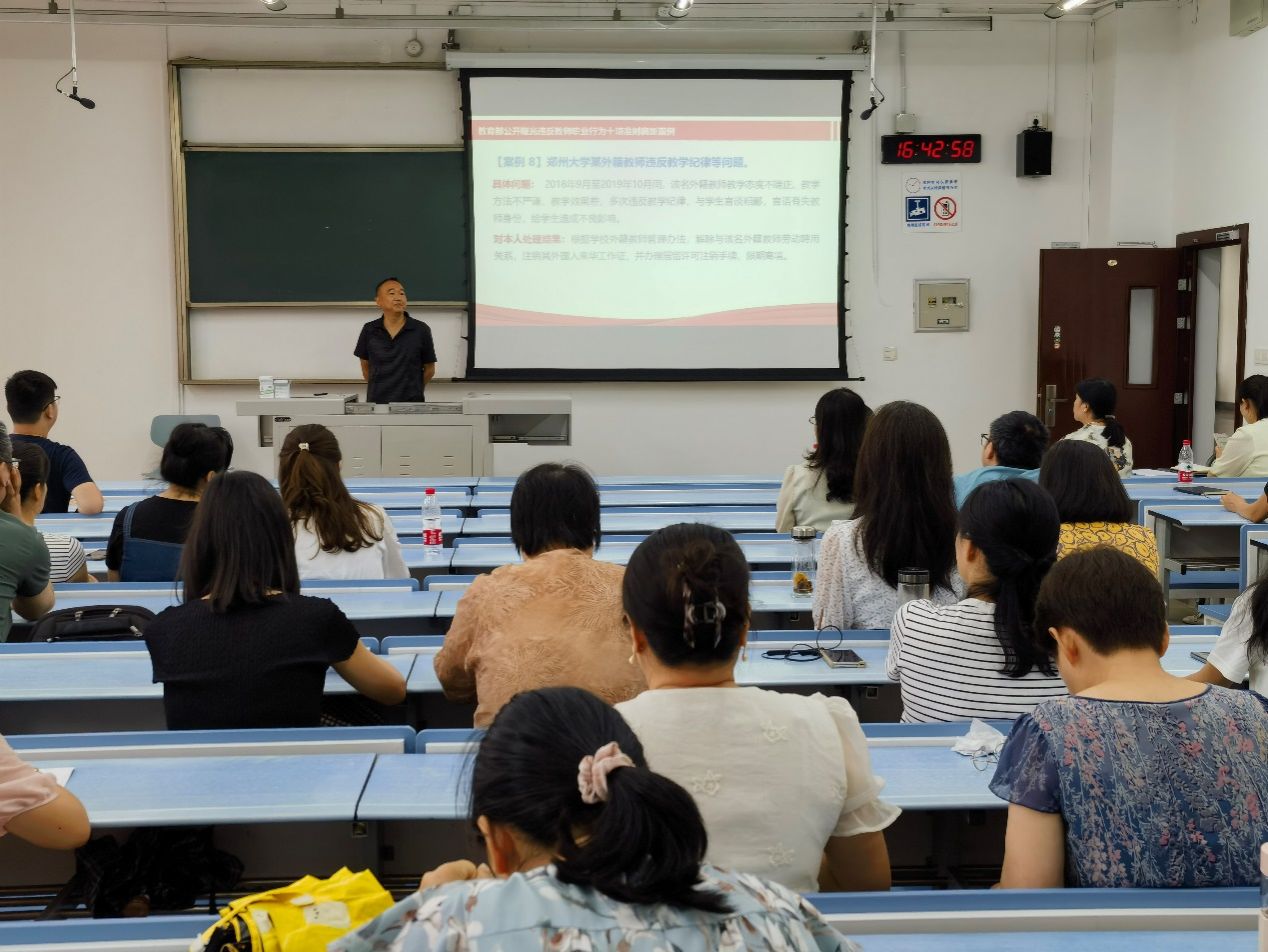 周先礼院长面向全体教职工开展了《新时代高校教师职业行为十项准则》宣讲。周先礼院长选取了八个典型案例,围绕学术不端、材料造假、行贿受贿、违规使用经费或获取经补贴、师生关系及外籍教师违纪问题进行师德失范警示教育,并要求老师们要在日常工作中时刻牢记教师职责,落实立德树人根本任务,弘扬新时代高校教师道德风尚。