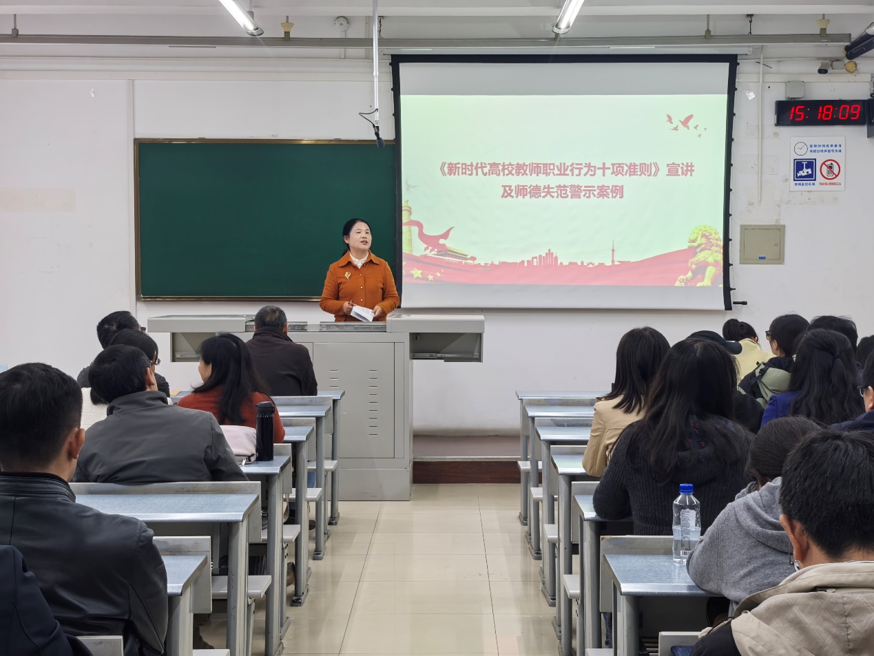黄春蓉书记作《新时代高校教师职业行为十项准则》宣讲。她结合师德失范警示案例,深刻剖析了师德师风建设的重要性与紧迫性,要求全体教师以案为鉴,自觉践行十项准则,以德立身、以德立学、以德施教、以德育德,以良好的师德师风引领学生健康成长,为培养更多优秀的人才贡献自己的力量!