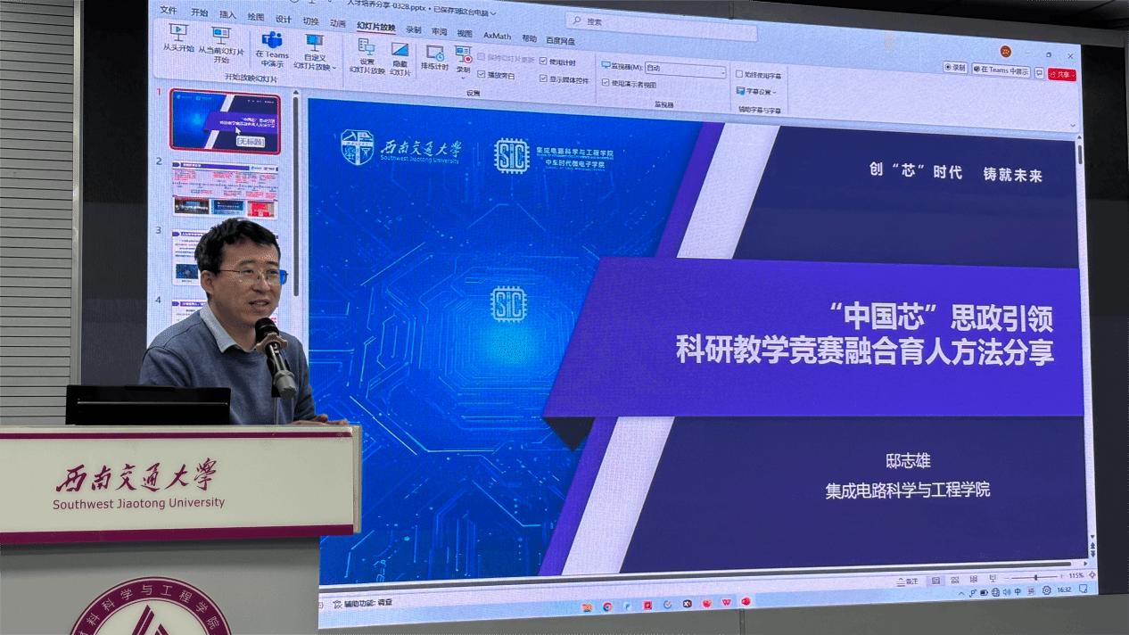 学院邀请到集成电路科学与工程学院邸志雄副院长以“‘中国芯’思政引领科研教学竞赛融合育人”为主题,分享了作为一线教师紧紧围绕立德树人根本任务,通过“教-赛-研”循环机制,回答“为谁培养人,培养什么样的人”这一实践问题。
