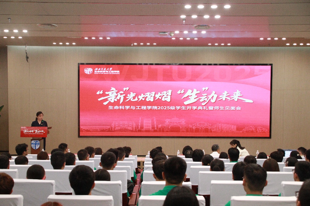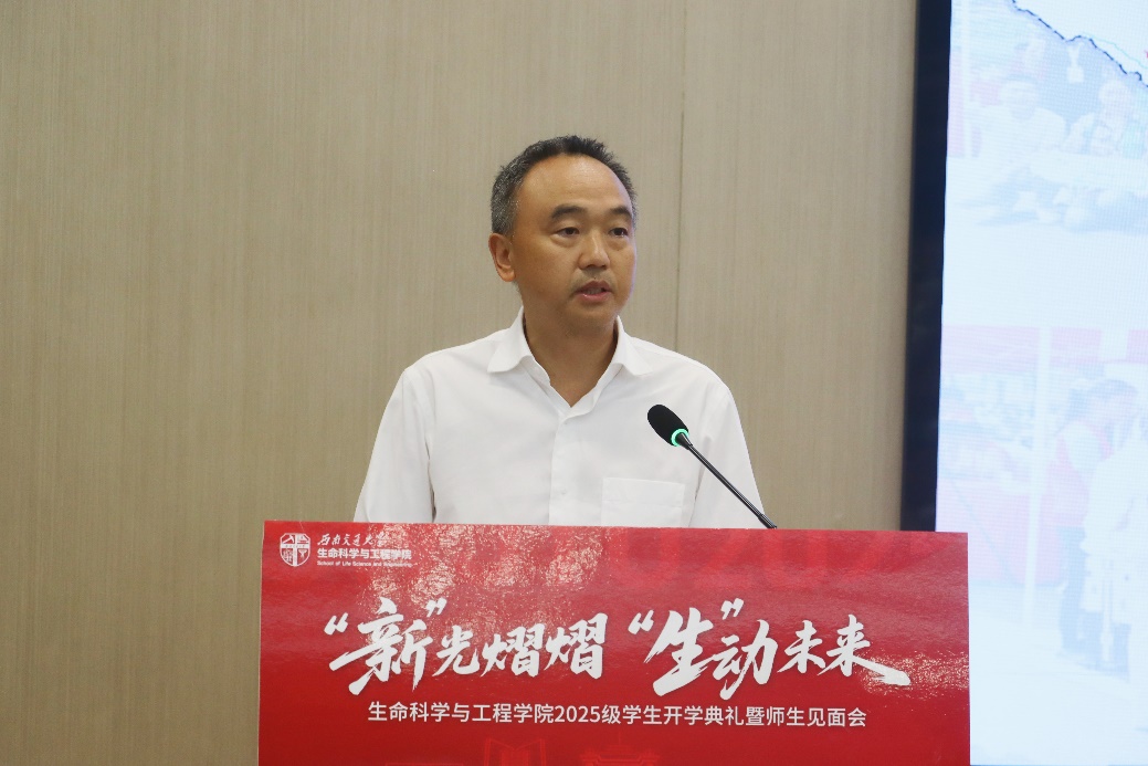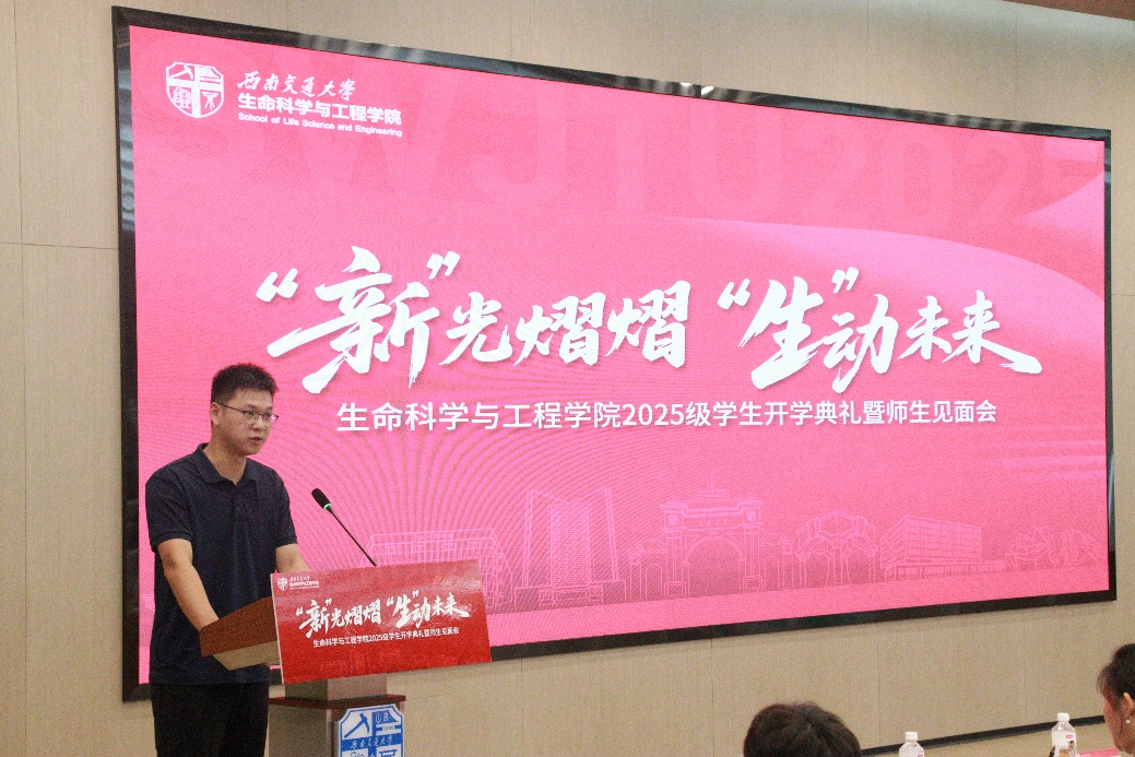 9月10日晚上,生命科学与工程学院2025级开学典礼在西南交通大学犀浦校区图书馆二号报告厅隆重举行。学院院长周先礼、学院党委书记黄春蓉及学院班子成员、内设机构负责人、班导师、全体辅导员等出席活动。典礼由学院党委副书记高鹏主持。