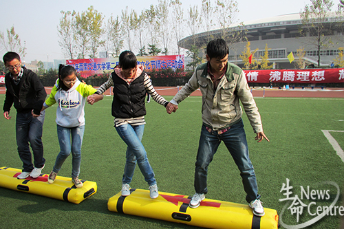 老师唱罢,学生登台,1600摸石过河比赛正式开始,每个队员挂着一脸认真的表情,每个动作都小心翼翼,生命小伙伴们通力合作,以两分五十一秒的成绩与留学生组并列亚军