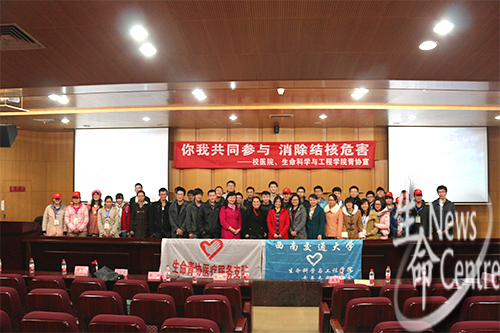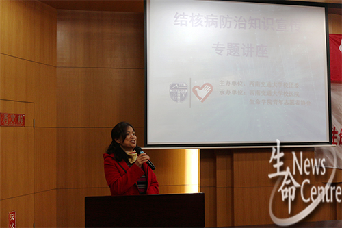 为增强大家结核防护意识,降低结核危害,由校团委主办,校医院、生命科学与工程学院青年志愿者协会承办的西南交通大学预防结核病讲座于11月29日晚在图书馆二号报告厅举行。参加本次讲座的嘉宾有校医院院长贾全芬老师、张卉老师,校医院内科糜瑛主任,校医院预防保健科高俊容主任以及生命学院团委副书记高鹏老师。校医院内科糜瑛主任担任本次讲座的主讲人。