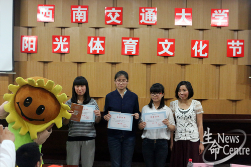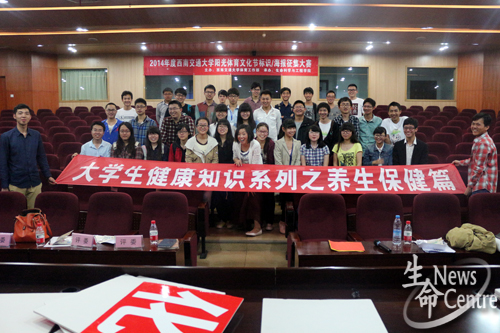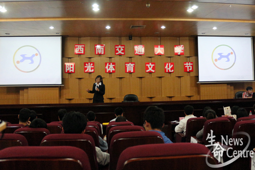 420日,西南交通大学体育部主办,生命科学与工程学院学生会承办的2014年度西南交通大学阳光体育文化节标识、海报征集大赛及大学生健康知识系列之养生保健篇于图书馆二号报告厅举行。出席活动的嘉宾及评委有体育部老师孙国欣赵晔石金丽,生命学院团委副书记高鹏,校会综合事务部部长陈景卉。