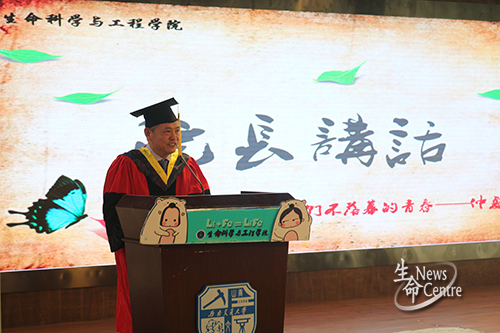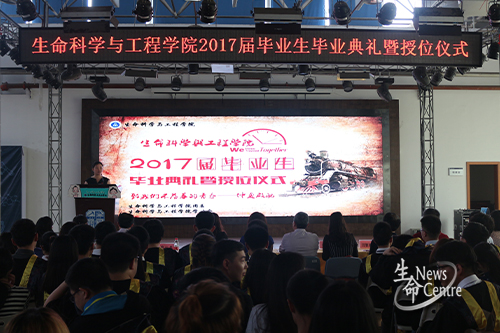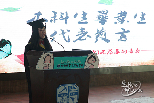 紧接着,本科生毕业生代表靳学发言。她感叹,曾经一直觉得时间过得很慢,但是突然间到毕业季,才觉得时光匆匆。研究生毕业生代表宋志磊在感谢领导与老师的同时,为生命学院送上祝福。他希望学院能够秉承“青春无悔,生命最美”精神,实现“生命跨越”目标。随后,李卓慧、陈学宏、黄新河分别向优秀毕业生代表赠送毕业礼物。