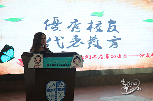 优秀校友代表邱槿怡带着给毕业生的赠言来到现场,当她说到珍惜身边人时,建议毕业生们拥抱座位旁的同学,同时她希望大家能尽早适应社会。教师代表黄新河希望同学们铭记“感恩、进取、信誉”,并祝毕业生们前程似锦。