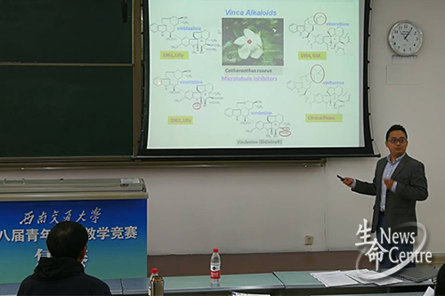 我院五位青年教师按要求编写教案、积极准备,通过模拟真实课堂,有层次、有重点地对专业知识进行讲授。高峰老师由屠呦呦从黄花蒿中提取青蒿素获得诺贝尔医学奖引入天然药物化学主题,重点介绍了抗肿瘤药物长春碱、紫杉醇以及喜树碱的发现及发展历程,并以最新的天然抗癌药物埃博霉素为例,提出了天然药物结合药物化学和药理学的研究仍是新药的重要来源。