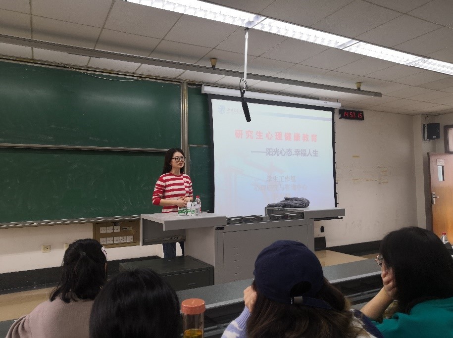 冯老师首先给大家分析了研究生阶段三个方面的心理——心理特点、心理困境以及心理健康。她认为研究生的心理特点目前处在埃里克森人生发展8阶段的青春期和成年早期,面临着学习内容变化、人际关系挑战、经济压力凸显和婚恋压力增大等诸多问题。紧接着,冯老师用幽默风趣的语言告诉大家应该如何有效应对这些问题,比如给自己设定具体的规划和目标,强化主动性和自觉性,多与导师交流沟通,防止拖延,避免抑郁,从而保持健康的心理状态,专注于学习和科研。在婚恋感情方面,她的独特见解也赢得了大家的热烈掌声。最后,冯老师对校内的心理研究与咨询中心和研究生心理学会进行了介绍,同学们可以在这里获取免费的心理援助。