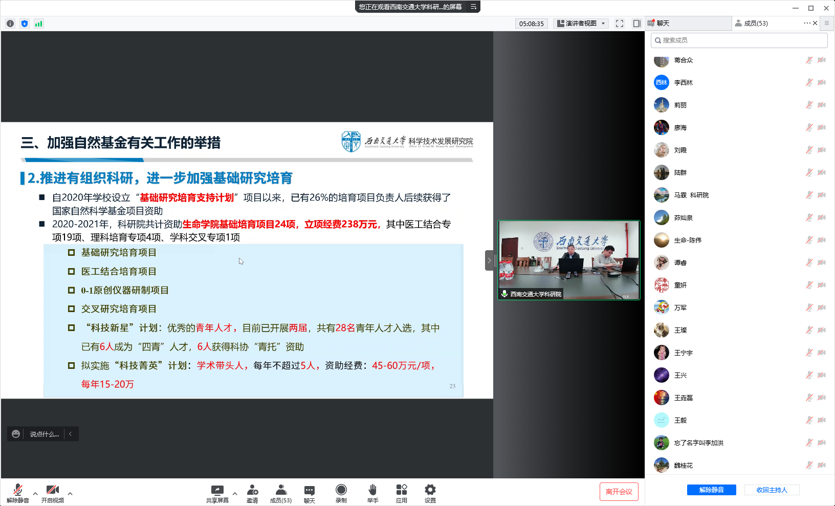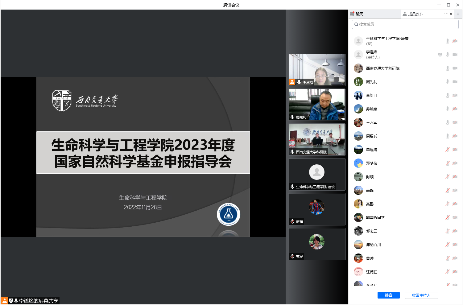 根据生命科学与工程学院科研工作安排,结合西南交大科学技术发展研究院对国家自然科学基金申报工作的整体部署,20221128日下午,通过线上形式举行了生命学院2023年度国家自然科学基金申报指导会,会议特别邀请了科研院王平院长做工作报告参加会议的还有科研院马霖副院长、刘海龙科长,材料学院周祚万教授、周绍兵教授生命学院周先礼院长、高峰副院长、封顺副院长、茆灿泉教授、王万军教授、孟涛教授、廖海副教授50多位老师,会议由李遂焰副院长主持。