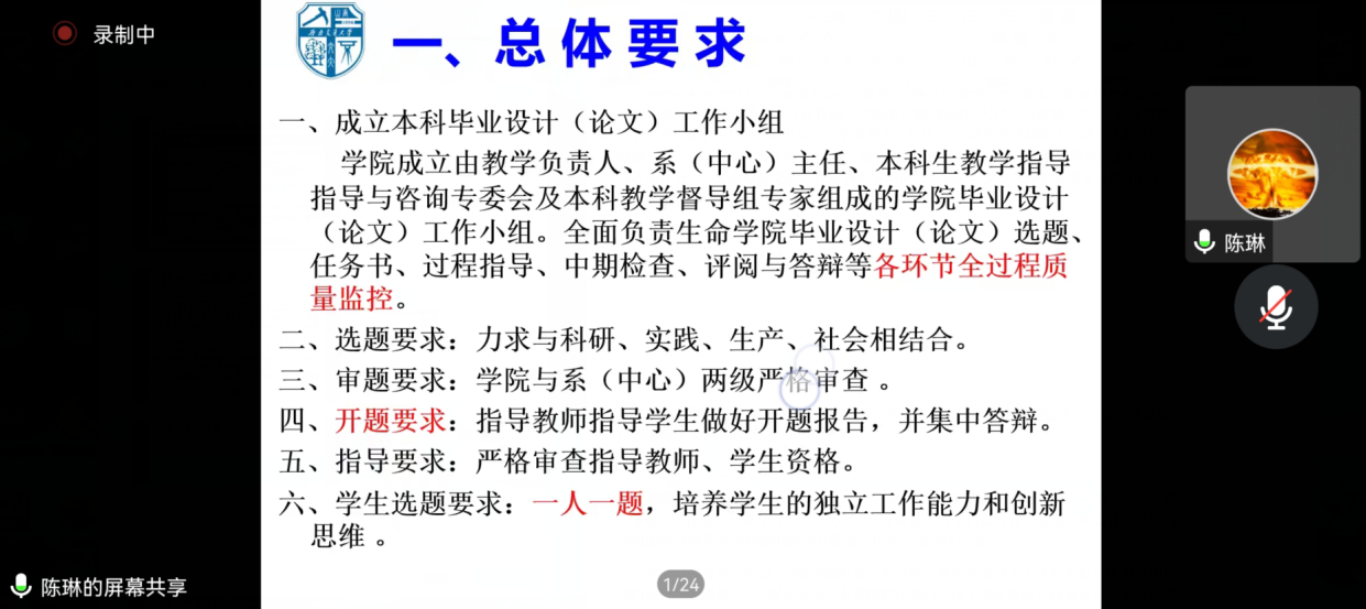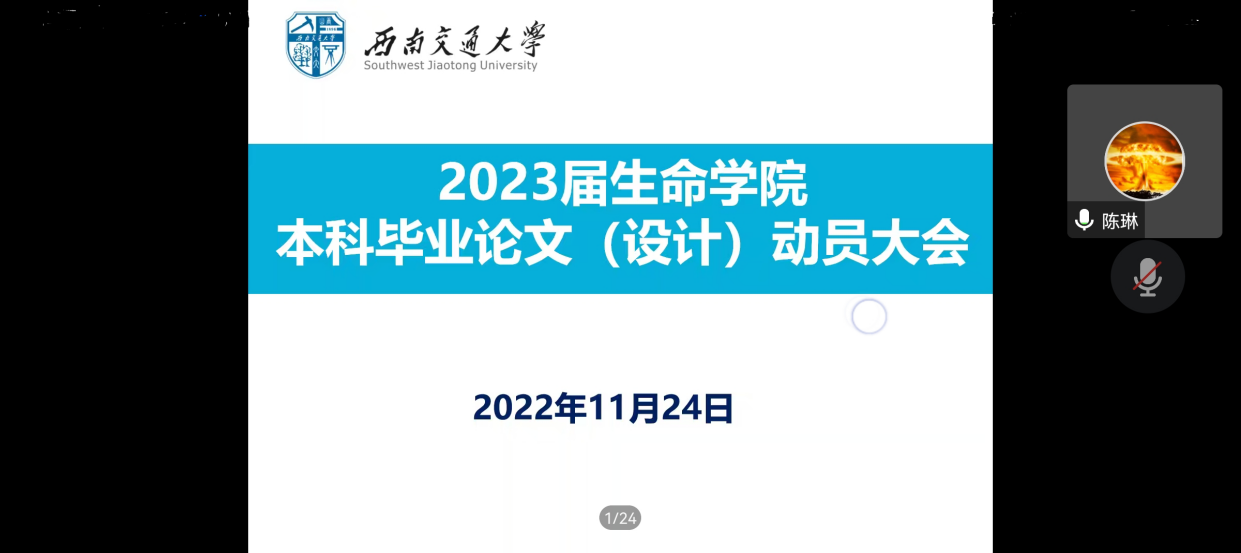 动员会上,生命科学与工程学院院长助理陈琳老师强调了毕业论文的重要性,希望同学们高度重视,严格按照学院毕业论文(设计)的相关文件要求和时间节点做好相关工作,希望同学们坚守诚信,树立正确的学习观、价值观,协调好论文和就业的关系,认真对待毕业论文工作,及时、主动地与指导老师联系,保质保量地做好毕业论文(设计)。