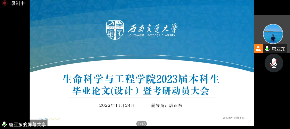 为有效落实学校学院毕业论文(设计)工作安排,确保毕业论文(设计)有序开展,同时对2023届考研学子考前激励,增强信心。2022年11月24日下午15:30,生命科学与工程学院2023届本科毕业论文(设计)暨考研动员大会在线上召开。生命科学与工程学院院长助理陈琳、教务员王谨、2019级辅导员唐亚东、新东方特邀英语讲师邓立老师及2023届本科毕业生参加,辅导员唐亚东老师主持大会。