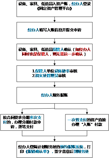 原系统:资产保管人需在《仪器设备管理系统》、《家具管理系统》、《低值耐用品管理系统》中打印《验收单》,到设备科盖章后,凭《验收单》、《报销确认单》及相关票据资料到计财处报账。