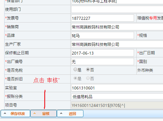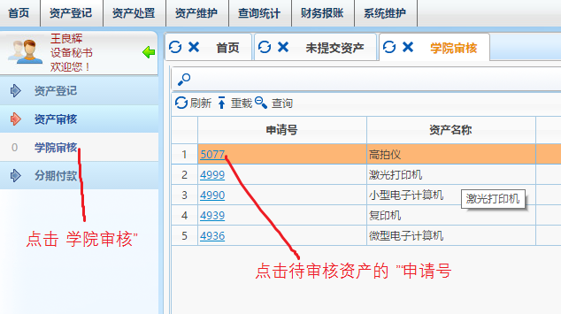 点击 “学院审核”后,点击待审核资产的”申请号”