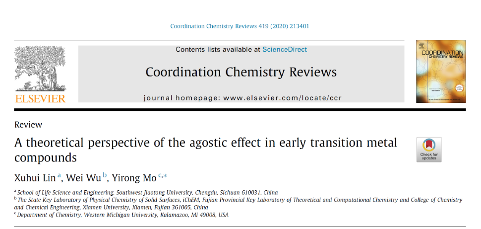 Recently, Dr. Xuhui Lin from the school of life science and engineering, published a paper entitled "A theoretical perspective of the agostic effect in early transition metal compounds“in “Coordination Chemistry Reviews". The paper reviewed the development and history of agostic bond in transition metal compounds, especially the theoretical works on its nature.