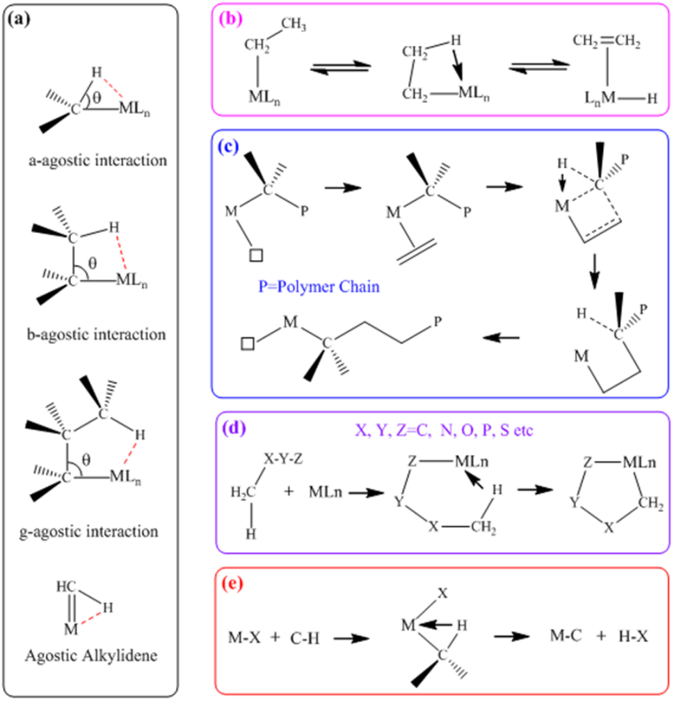 Figure.(a) Types of agostic interactions and their involvements in (b) β-Hydrogen elimination,(c) Ziegler–Natta polymerization, (d) C-H bond activation and (e) cyclometallation.
