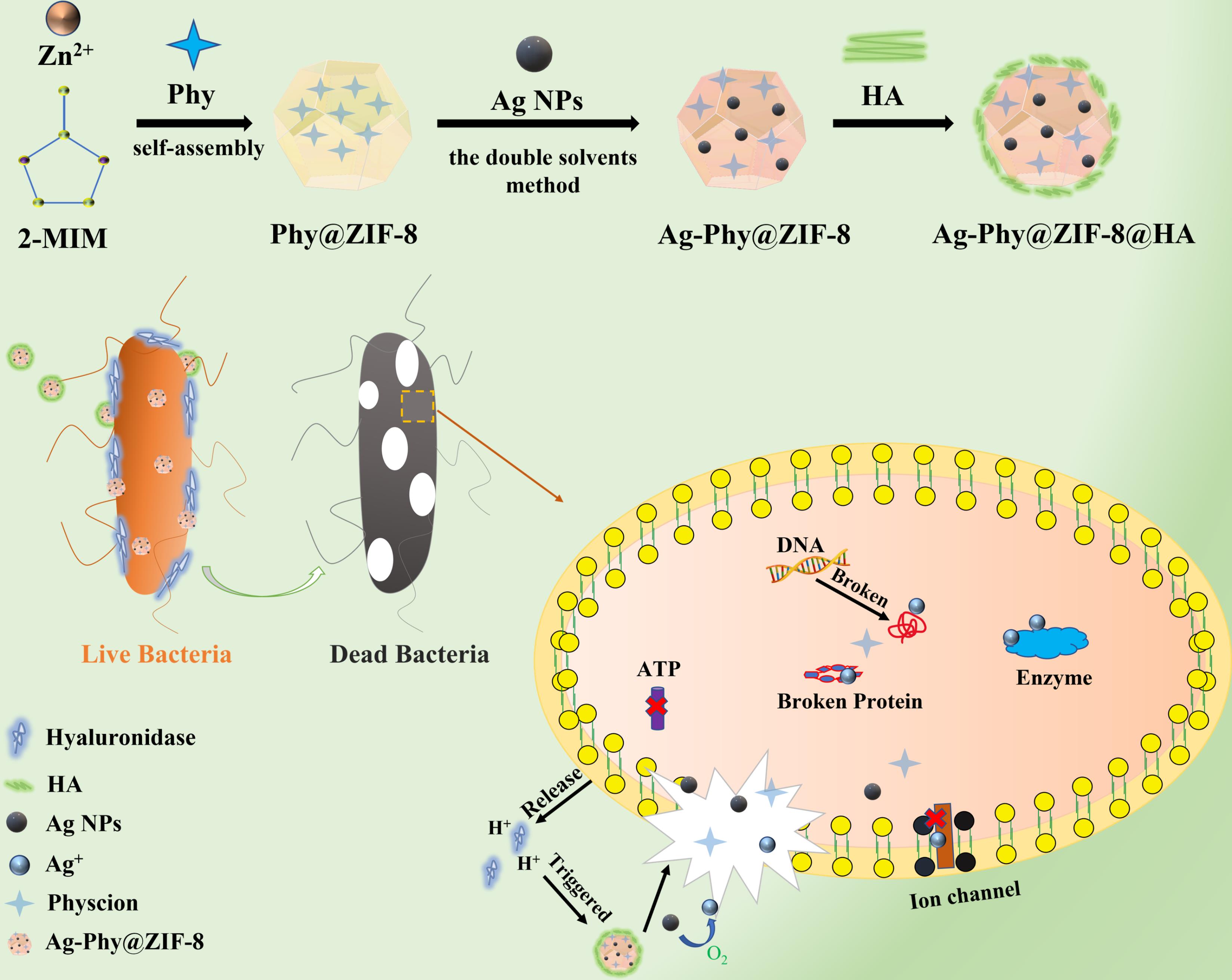 沸石咪唑酯骨架(ZIF-8)是一种金属有机骨架(MOFs),由于其优异的生物相容性,在细菌感染领域具有一定应用前景。在这里,我们报告了在 ZIF-8 中封装银纳米粒子 (Ag NPs),并嵌入大黄素甲醚 (Phy),以获得具有高效和智能协同抗菌能力的 Ag-Phy@ZIF-8。由于细菌周围的微酸性环境,Ag和Phy呈可控释放。此外,Ag-Phy@ZIF-8 被透明质酸 (HA) 修饰,记为 Ag-Phy@ZIF-8@HA,对大肠杆菌(99.1%) 和金黄色葡萄球菌(99.5%)消杀效果良好,且不影响细胞生长,具有良好的生物相容性。此类pH响应的生物复合材料在用于细菌感染的智能伤口辅料上具有潜在的应用价值。