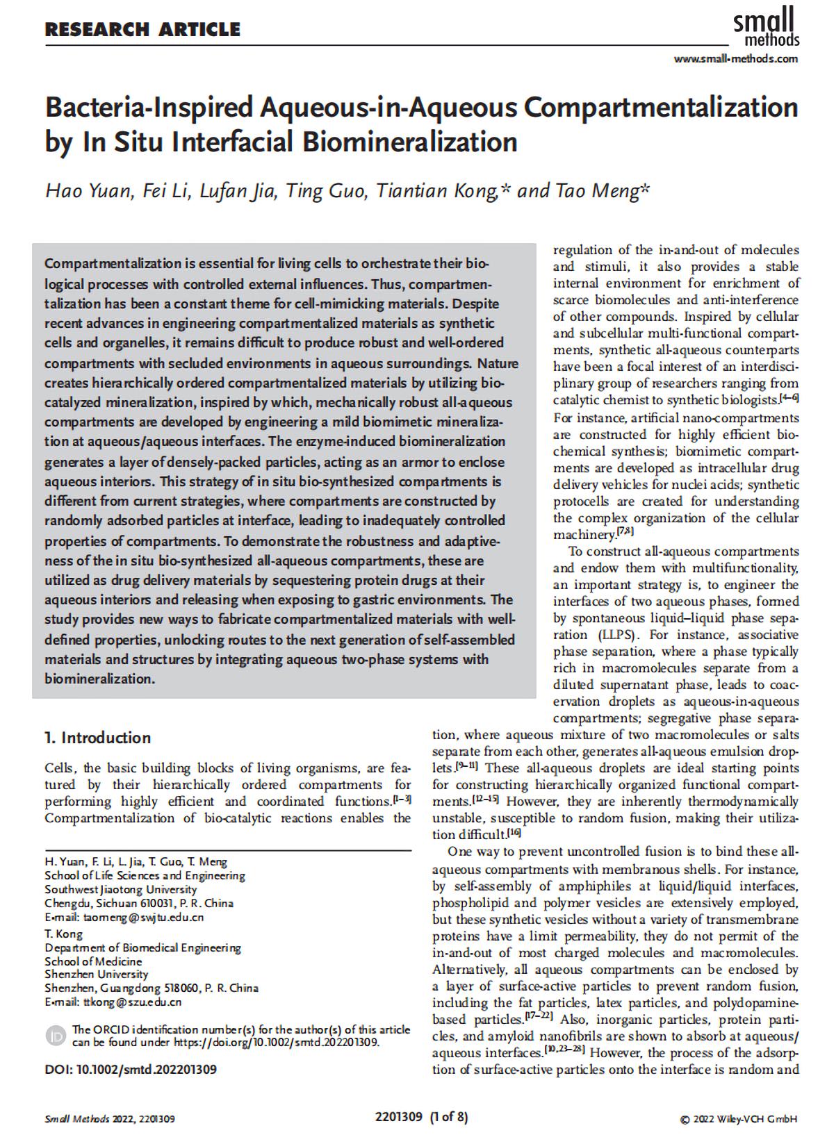 近日,国际生物医学、化学、物理学和材料学领域权威期刊《Small Methods》(影响因子15.367)报道了我校“微纳生物技术”创新团队孟涛教授的研究成果“Bacteria-Inspired Aqueous-in-Aqueous Compartmentalization by In Situ Interfacial Biomineralization”中文译名:“受细菌启发的全水隔室界面原位仿生矿化”(DOI: 10.1002/smtd.202201309)。论文第一作者为生命科学与工程学院苑昊老师和2018级硕士研究生李飞,通讯作者为深圳大学生物医学工程学院孔湉湉副教授和开云kaiyun网页版官网孟涛教授,西南交通大学为第一署名单位。